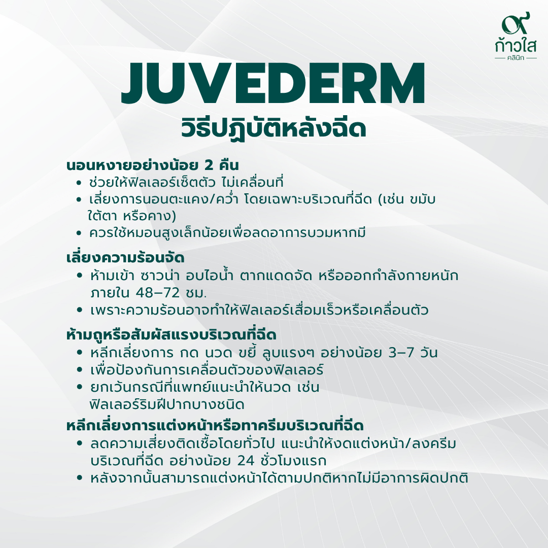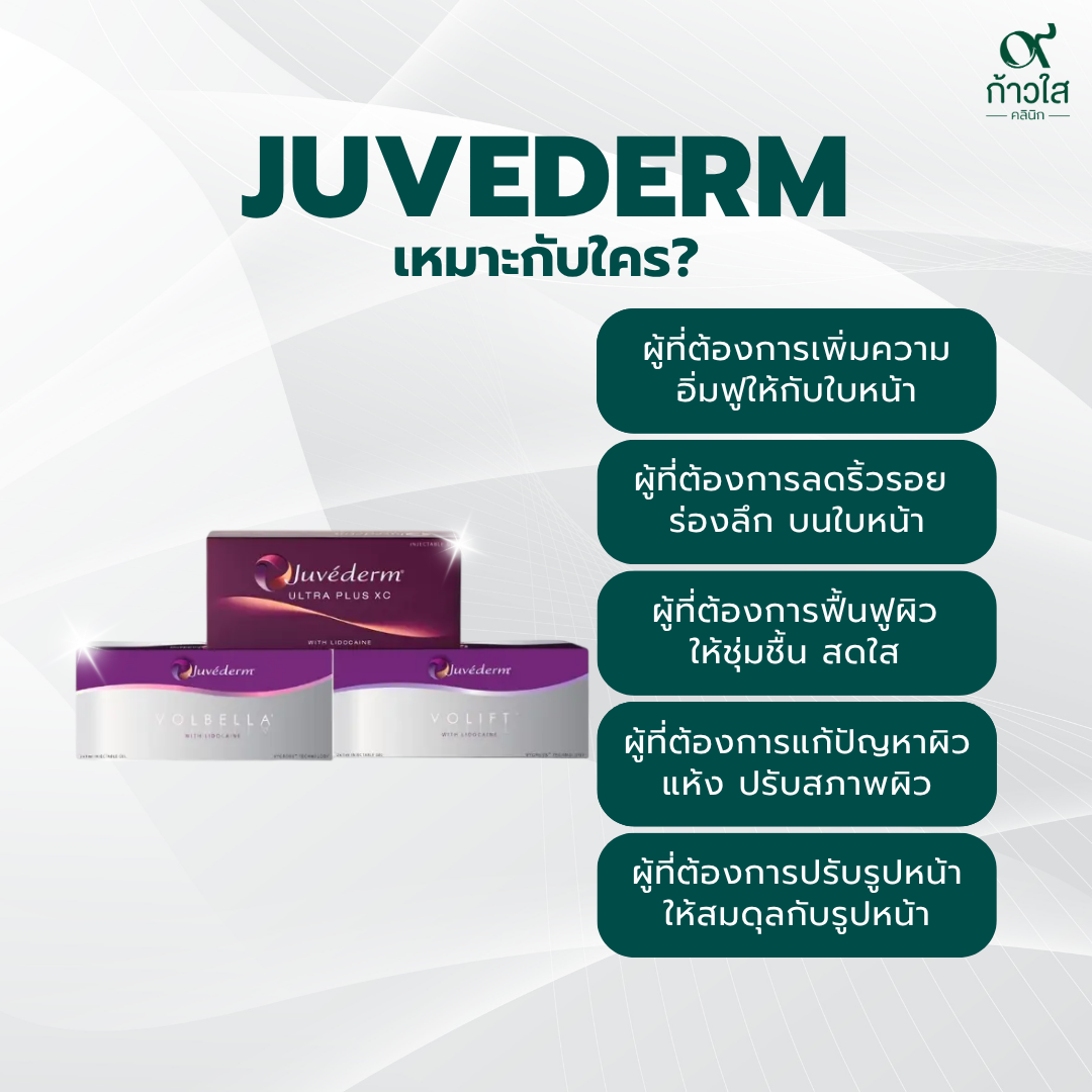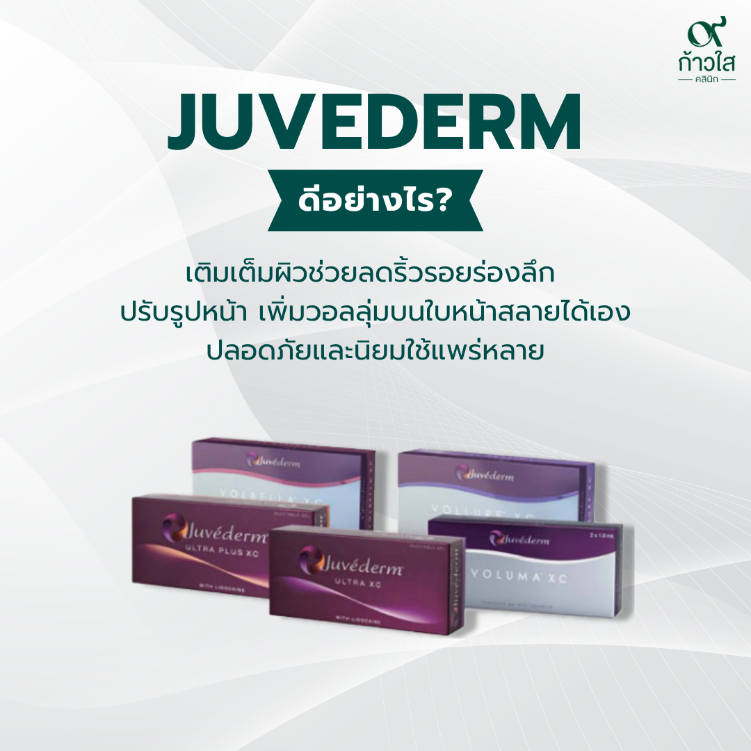 ฟิลเลอร์คุณภาพสูงจากประเทศสหรัฐอเมริกา ผลิตโดยบริษัท Allergan ผู้นำด้านเวชภัณฑ์ความงามระดับโลก ตัวฟิลเลอร์ทำจากสาร Hyaluronic Acid (HA) ซึ่งเป็นสารที่พบได้ตามธรรมชาติในร่างกายของมนุษย์ โดยเฉพาะในผิวหนังและเนื้อเยื่อเกี่ยวพัน จึงทำให้มีความปลอดภัยสูง และสามารถย่อยสลายได้เองตามธรรมชาติ Juvederm มีคุณสมบัติเด่นในการช่วยเติมเต็มผิวที่มีปัญหาร่องลึก ริ้วรอย หรือจุดที่สูญเสียปริมาตรจากอายุที่เพิ่มขึ้น อีกทั้งยังช่วยปรับรูปหน้าให้ดูสมส่วนขึ้นอย่างเป็นธรรมชาติ โดยไม่ต้องผ่าตัด พร้อมทั้งผ่านการรับรองจากทั้ง US FDA และ อย. ประเทศไทย จึงมั่นใจได้ในความปลอดภัยและคุณภาพ