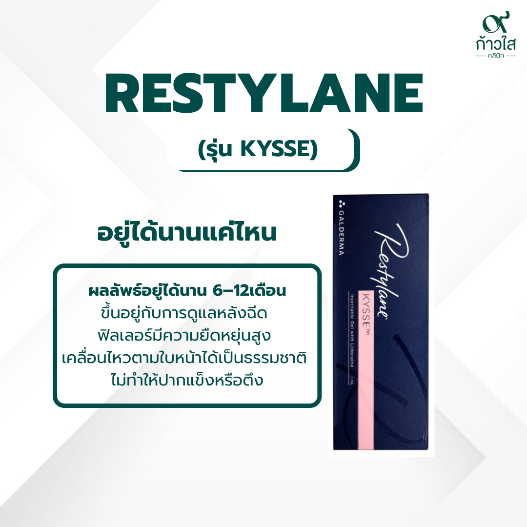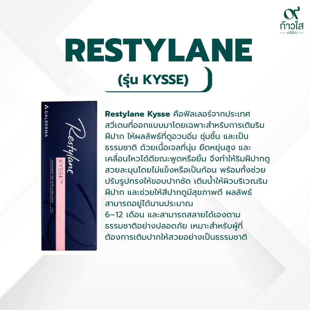 Restylane Kysse เป็นฟิลเลอร์ที่ออกแบบมาเพื่อฉีดบริเวณริมฝีปาก ได้รับการรับรองให้ฉีดเฉพาะบริเวณ ริมฝีปาก และร่องเล็กๆ รอบปากบนเท่านั้น ไม่ได้ออกแบบมาใช้ในบริเวณอื่นของใบหน้า เพื่อสร้างขอบปากให้คมชัดและได้รูปทรงที่ต้องการ เนื้อนิ่มทำให้ฉีดแล้วเป็นธรรมชาติ ไม่เป็นก้อน มีความยืดหยุ่นสูง เข้ากับริมฝีปากได้ดี ไม่แข็ง