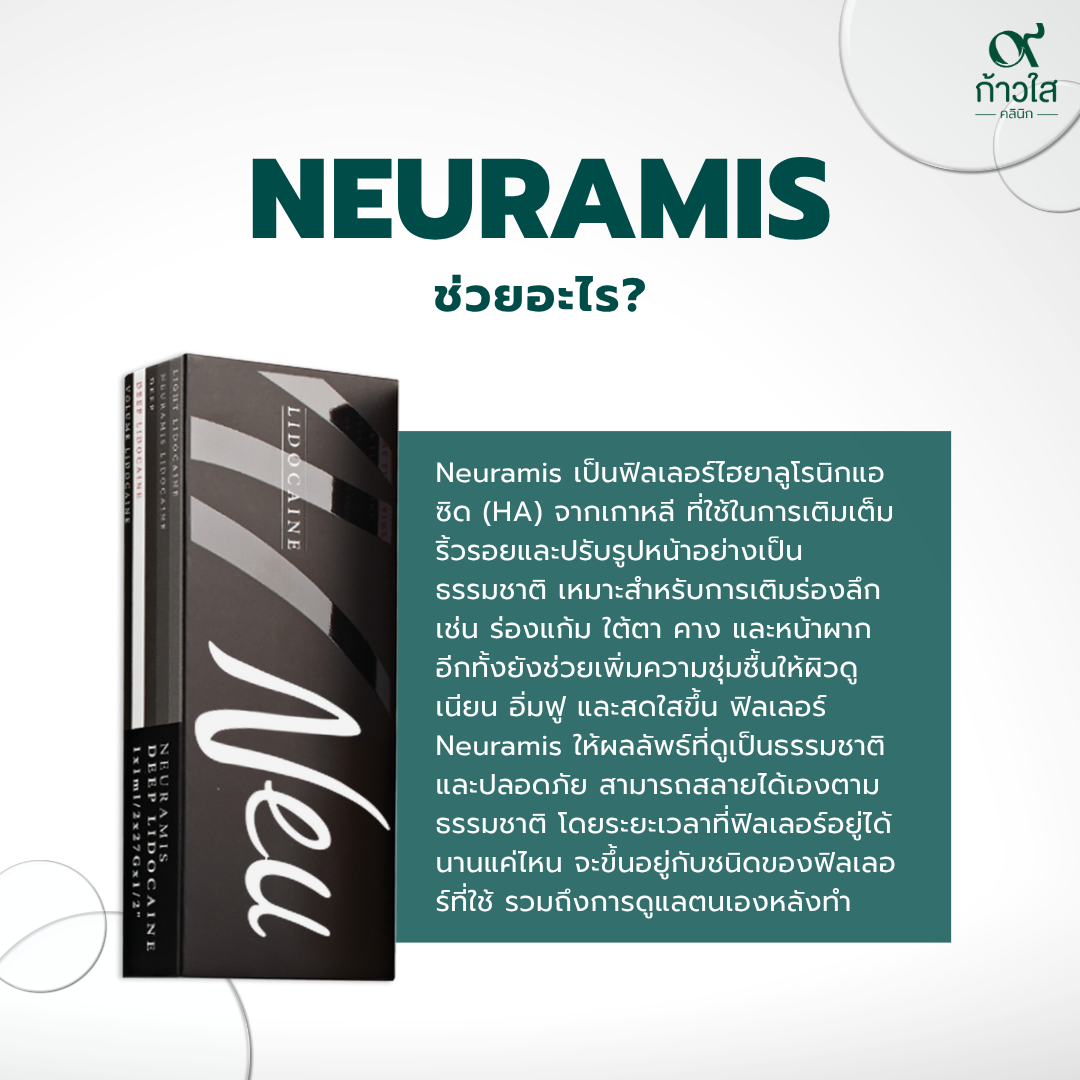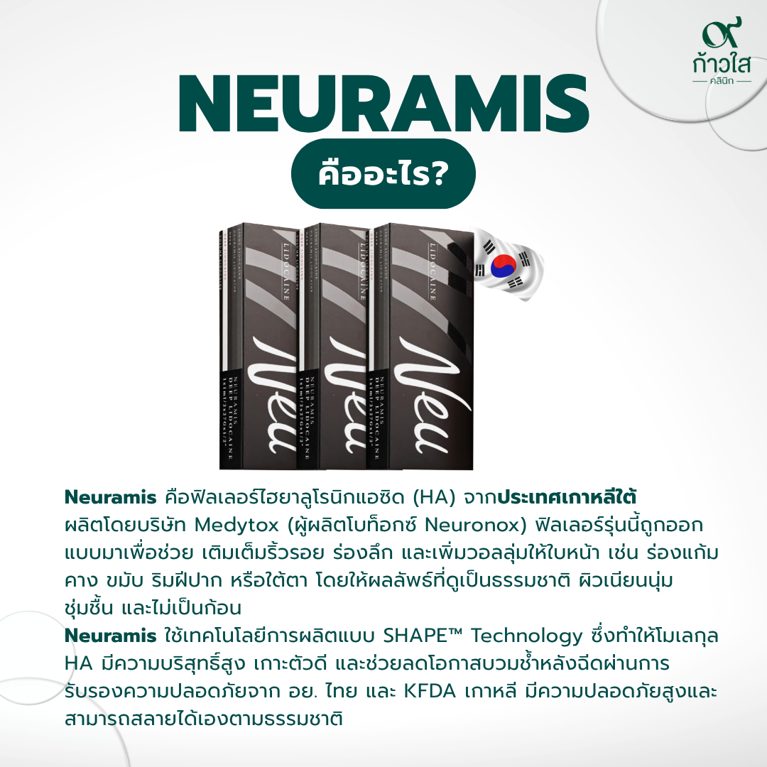 Neuramis เป็นฟิลเลอร์ชนิด Hyaluronic Acid (HA) พัฒนาโดยบริษัท Medytox ของเกาหลีใต้ ใช้เทคโนโลยี SHAPE (Stabilized HA and Purification Enhancement) และ HA ที่ผลิตจากการหมักแบบไม่มีสัตว์ (non‑animal) ซึ่งช่วยให้ได้สารที่บริสุทธิ์สูง มีการ cross‑link อย่างเหมาะสม ทำให้เนื้อเจลคงตัวนาน ฟื้นตัวไว และเข้ากันดีเมื่อฉีดลงผิว มีคุณสมบัติในการเติมเต็มริ้วรอย ร่องลึก และปรับรูปหน้าให้ดูอิ่มฟู โดยสามารถสลายตัวได้เองตามธรรมชาติ Neuramis เป็นที่รู้จักและได้รับความนิยมในวงการความงามเนื่องจากคุณภาพที่ได้มาตรฐานและความปลอดภัย