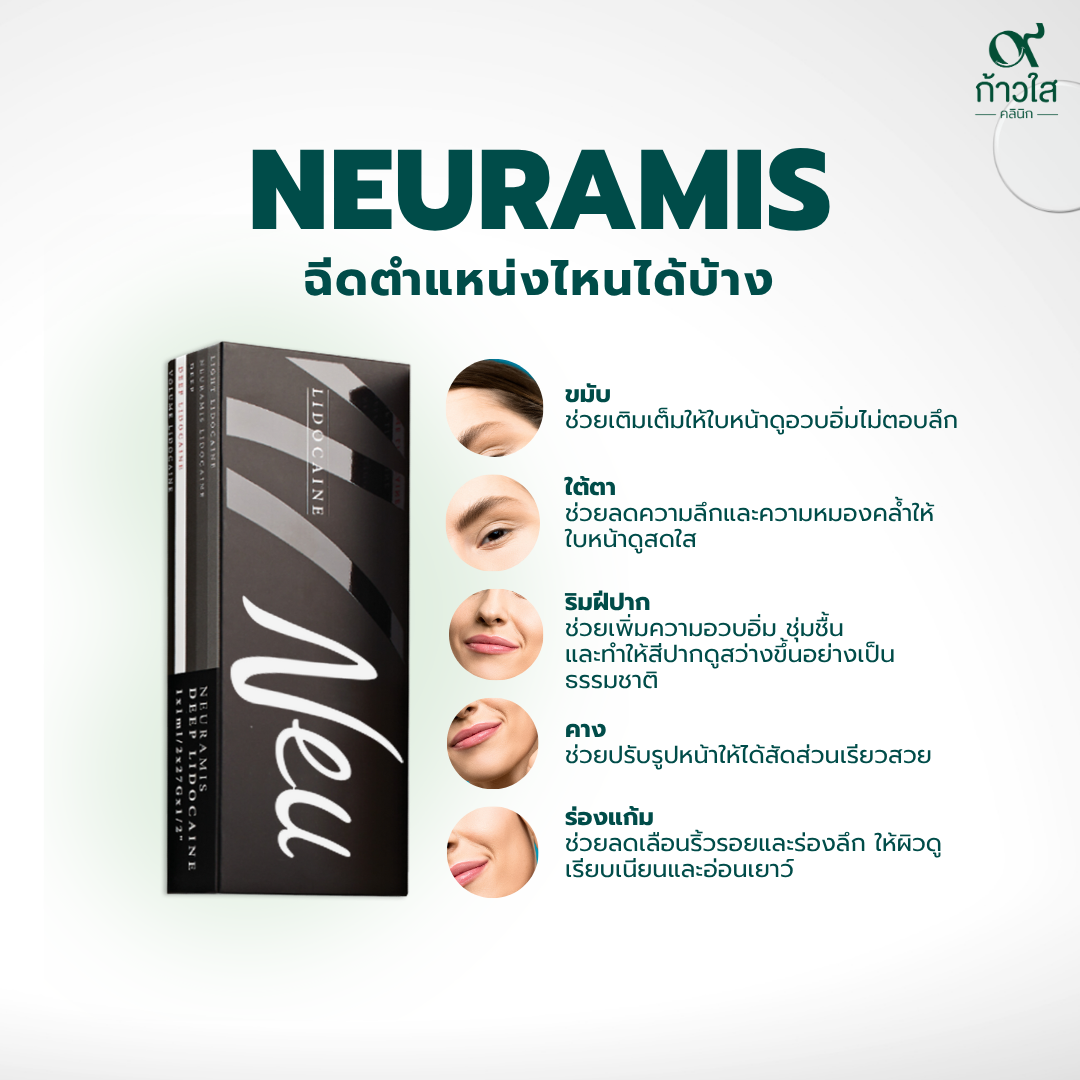 Neuramis เนื้อเจลมีความหนาแน่นสูงและหนืดที่สุดในทุกรุ่น มีความคงตัวได้ดี ขึ้นทรงได้สวย มีส่วนผสมของยาชา เหมาะสำหรับปรับรูปหน้า เติมเต็มส่วนที่ยุบหรือตอบ และเติมเต็มริ้วรอยระดับปานกลางถึงลึก เช่น โหนกแก้ม คาง ปลายจมูก เติม volume ยกกระชับใบหน้า ช่วยให้ผิวดูชุ่มชื้นและอิ่มฟูขึ้นทันทีหลังฉีด อยู่ได้นานประมาณ 12-18 เดือน