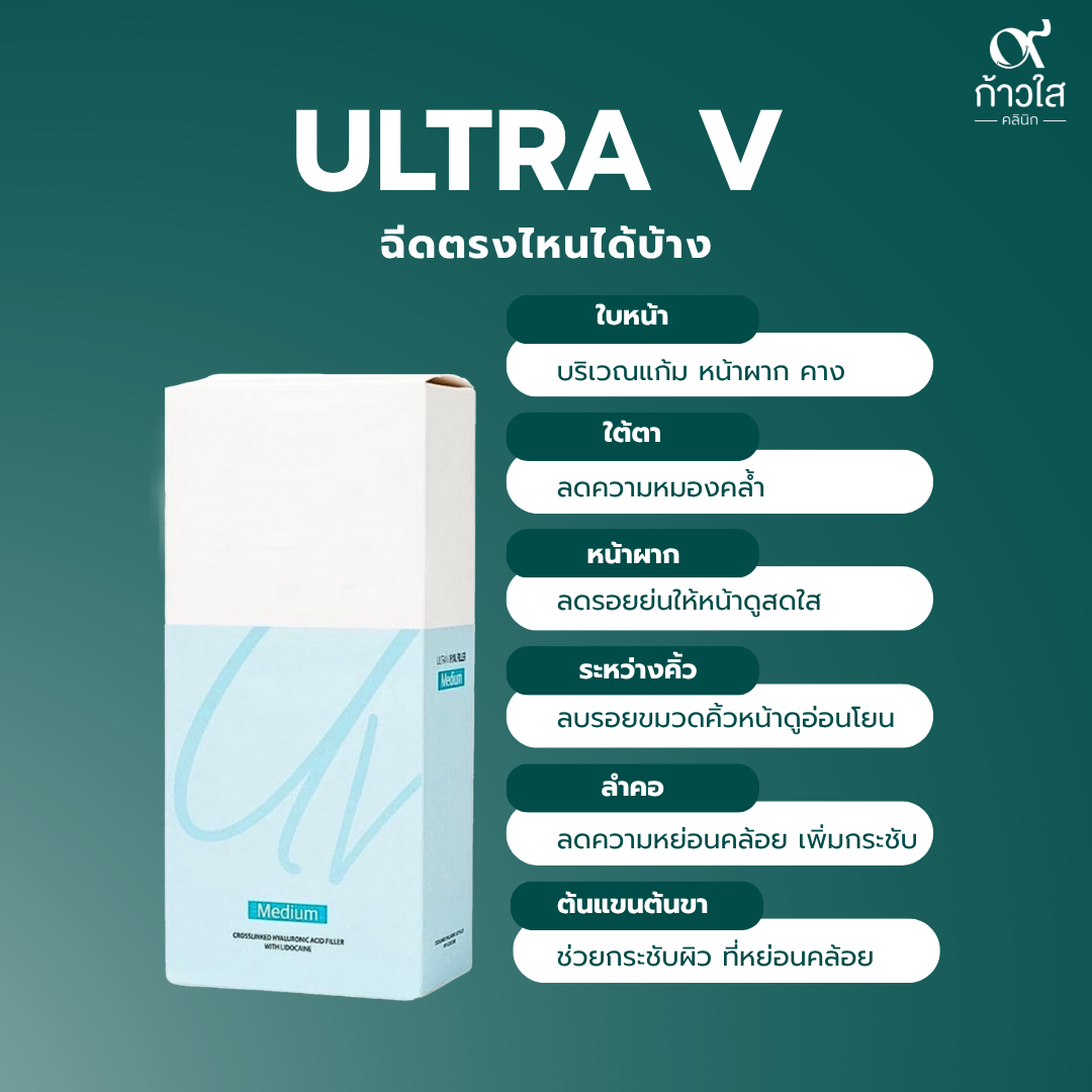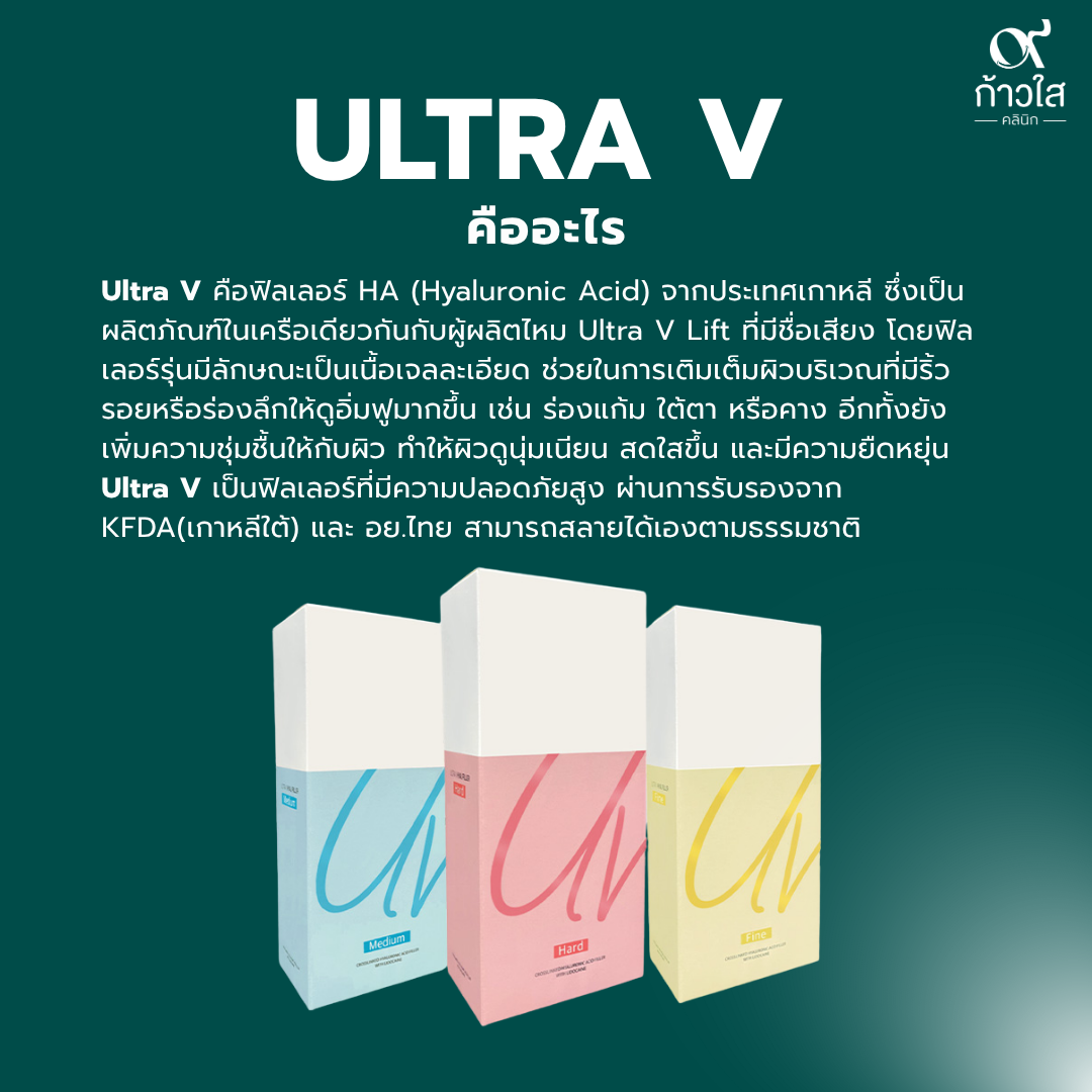 Ultra V เป็นฟิลเลอร์ตัวเเรกที่มีโมเลกุล 2 ชนิด ที่มีความบริสุทธิ์สูง เทียบกับกรดไฮยาลูโรนิก ที่พบได้ตามธรรมชาติ ในร่างกายของมนุษย์ เป็นฟิลเลอร์ชนิด ที่ผลิตโดยบริษัท Ultra V เป็นชื่อผลิตภัณฑ์และเทคโนโลยีจากประเทศเกาหลีใต้ โดยใช้เทคโนโลยี R‑Square และการผสมเนื้อเจลแบบ Multi‑phasic ที่ประกอบด้วยเนื้อแบบ monophasic และ biphasic เข้าด้วยกัน เพื่อให้เนื้อเจลมีความยืดหยุ่น แต่ยังคงความคงตัว ประสิทธิภาพสูง เหนือกว่า HA fillers ทั่วไป มีคุณสมบัติเด่นคือเนื้อฟิลเลอร์มีความยืดหยุ่นสูง ทำให้ฉีดง่าย เจ็บน้อย และผลลัพธ์อยู่ได้นาน