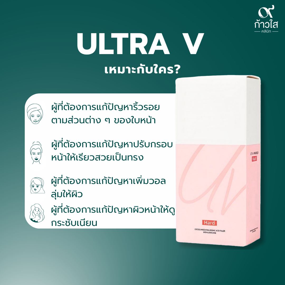 ฟิลเลอร์ Ultra V มีความโดเด่นด้วยเรื่องของเทคโนโลยีการผลิตด้วยการผสานฟิลเลอร์แบบ Monophasic และ Biphasic เข้าด้วยกันเป็นรายแรกของโลกเหมาะสำหรับผู้ที่ต้องการ แก้ไขปัญหาผิวหย่อนคล้อย ริ้วรอย ร่องลึก และปรับหน้าให้ดูเรียวและได้สัดส่วน ฟื้นฟูผิวให้แข็งแรง ยืดหยุ่น เนื้อฟิลเลอร์แบบ Multi-Layered ที่มีความยืดหยุ่น เรียบเนียนกลืนเข้ากับผิวได้อย่างเป็นธรรมชาติ เติมเต็มผิวหน้าให้ได้อย่างสมดุลและดูเป็นธรรมชาติ