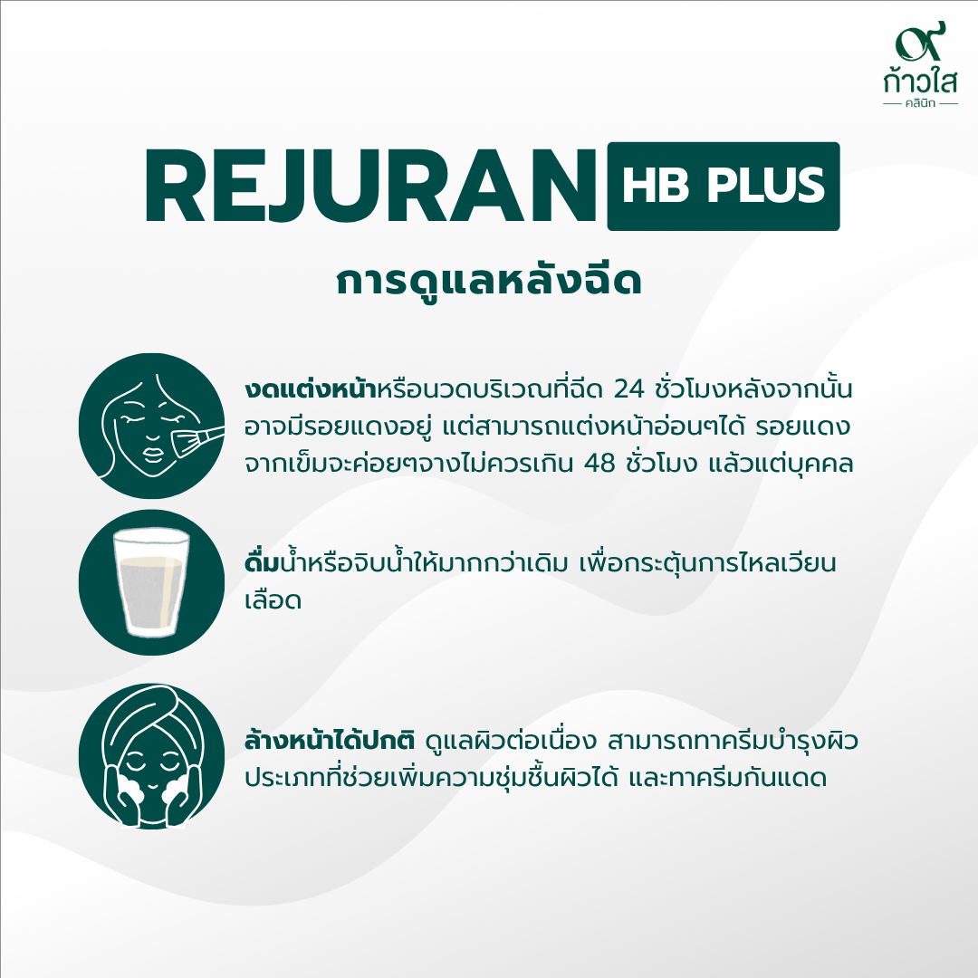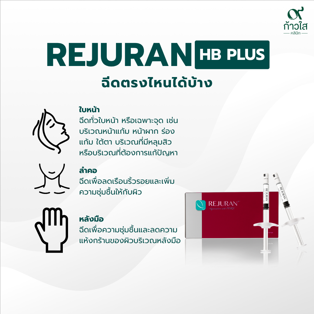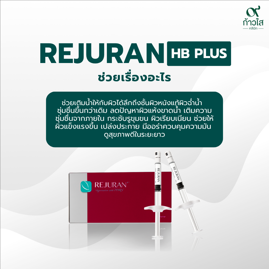 สรุป Rejuran HB plus เป็นเวอร์ชันที่พัฒนาต่อยอดมาจาก Rejuran Healer (รีจูรันกล่องดำ) โดยยังคงมีส่วนผสมหลักอย่าง Polynucleotide (PN) ที่ช่วยฟื้นฟูผิวจากภายใน และช่วยซ่อมแซมเซลล์ผิวที่เสื่อมสภาพ ทำให้ผิวกลับมาแข็งแรง ดูสุขภาพดี ซึ่งความพิเศษของสูตรนี้คือการเพิ่ม Hyaluronic Acid (HA) และมียาชาในตัว ช่วยลดความรู้สึกแสบระหว่างการฉีดรีจูรัน เหมาะสำหรับ มือใหม่หัดฉีดหน้า โดยเฉพาะคนที่กังวลเรื่องความเจ็บ แสบระหว่างการฉีด เพราะสูตรนี้มียาชาในตัว ช่วยลดความเจ็บได้ดี พร้อมทั้งคงคุณสมบัติเด่นในเรื่องการฟื้นฟูผิวลึกถึงระดับเซลล์