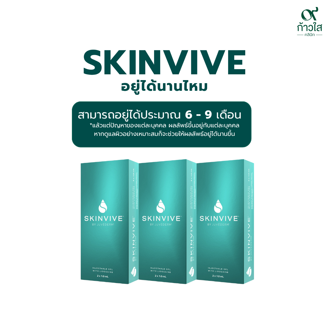 ฉีด skinvive สามารถอยู่ได้นานประมาณ 6-9 เดือน แล้วแต่ปัญหาของแต่ละบุคคล ผลลัพธ์ขึ้นอยู่กับแต่ละบุคคล หากดูแลผิวอย่างเหมาะสม ก็จะช่วยให้ผลลัพธ์อยู่ได้นานขึ้น