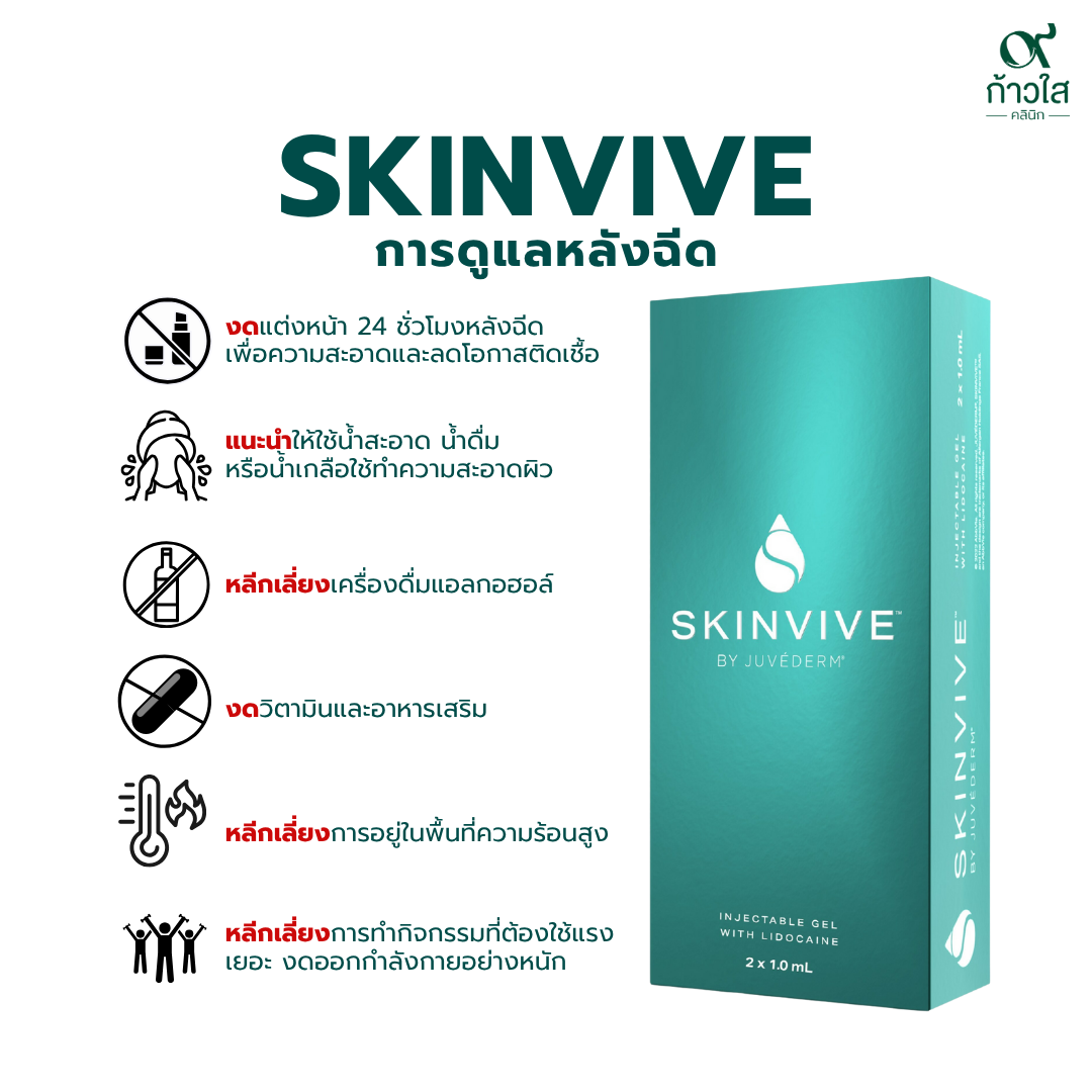 สรุป เป็นผลิตภัณฑ์ที่ฉีด เพื่อแก้ปัญหาผิวแห้งกร้าน ขาดน้ำ ขาดการบำรุง เพิ่มความชุ่มชื้นให้ผิว ทำให้ผิวดูฉ่ำวาว ช่วยให้รูขุมขนกระชับขึ้น ซึ่ง Skinvive ได้รีแบรนด์มาจาก Juvederm Volite นำมาปรับให้มีประสิทธิภาพดีขึ้น สามารถนำมาฉีดที่มือหรือคอได้ และยังฉีดควบคู่กับโบท็อกซ์ หรือไหมน้ำ เพื่อผลลัพธ์ที่ดียิ่งขึ้น ในการฉีดเพียงครั้งเดียว และสามารถคงอยู่ได้ยาวนานมากถึง 9 เดือน
